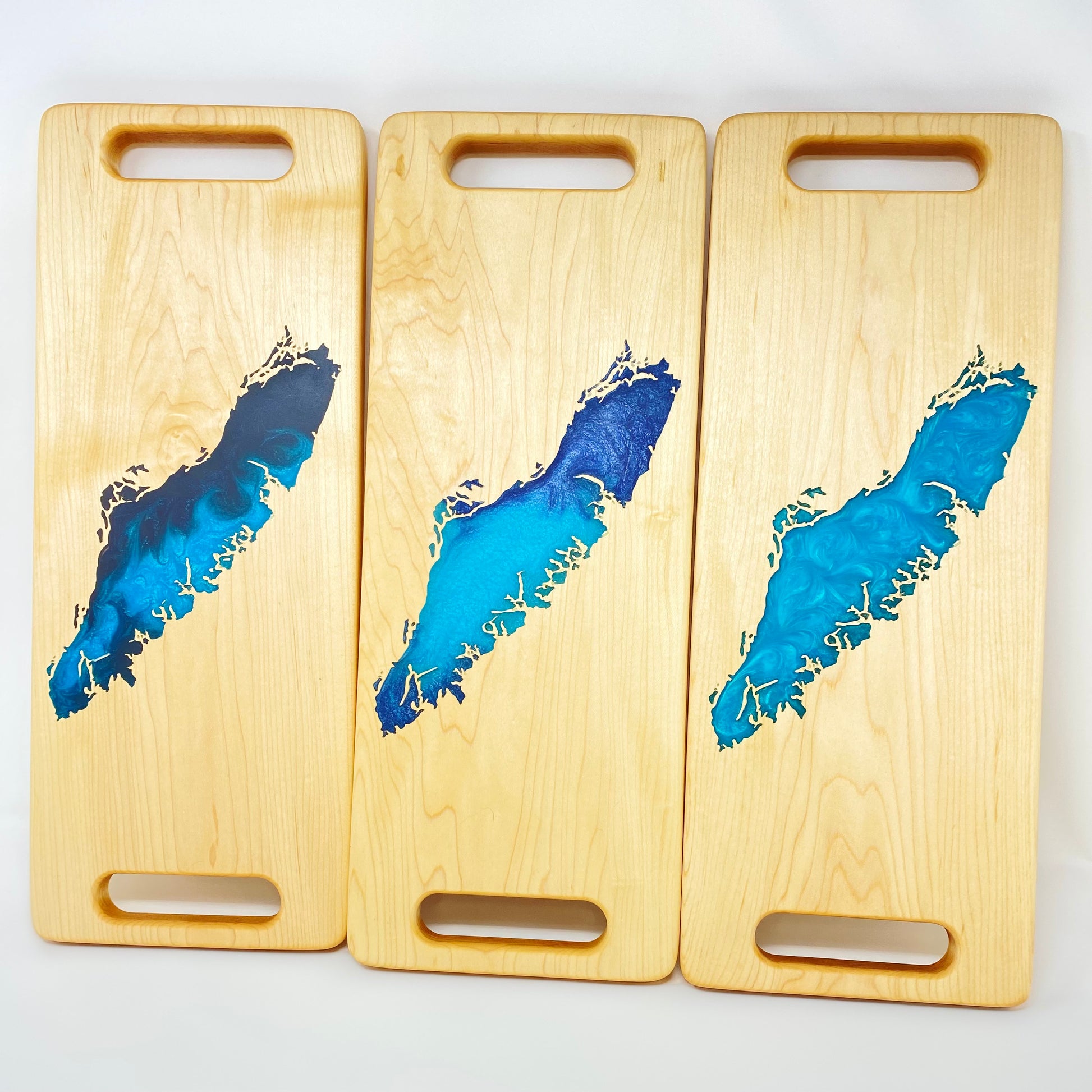 Dimensions of the board are roughly 18"x7" with a thickness of 3/4"-1" depending on the wood used.
